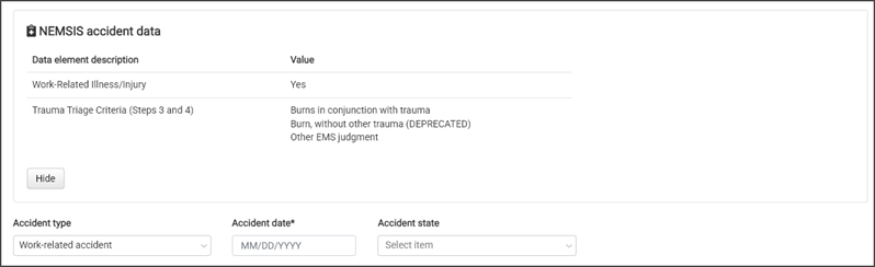 Click the View NEMSIS accident data link to see if accident data was included in the file. If so, that information will display in the "Accident type" field.