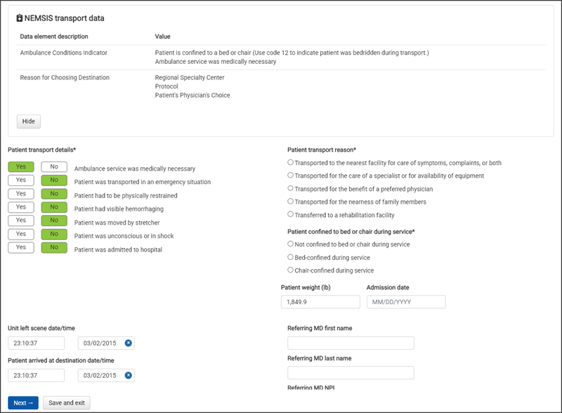 Click the View NEMSIS transport data link to verify the "Patient transport details."