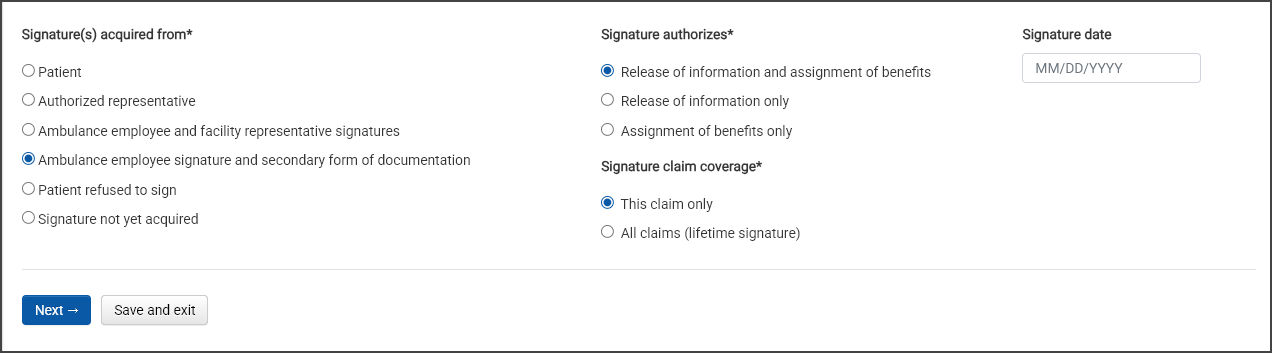 The system uses the information in the import file to fill out most of the information in the transport details tab. You will need to fill out "Accident type", "Patient transport reason", "Patient confined to bed or chair during service", and signature information.