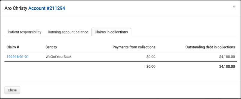 Click the Claims in collections tab. Note that if there are zero claims for this patient currently in collections, the tab will not be active.