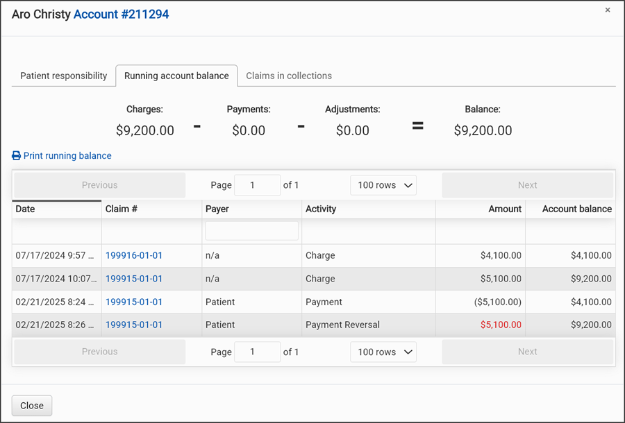 If the account is not in collections, you can use a combination of the information from the "Patient responsibility" and "Running account balance" tabs to help make a determination on your next steps. Here are some examples: