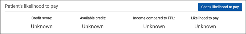 Likelihood to pay runs automatically when the patient is new, when the claim moves to Patient Billing, and when a user accesses the Patient Billing page. You can also run it from this window by clicking the Check likelihood to pay button. The results of the likelihood to pay query is divided in four categories, credit score, available credit, income compared to federal poverty level, and likelihood to pay.