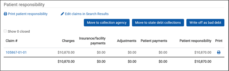 Write off as bad debt: In cases where collection is not worth the effort or impossible to obtain, use the "Write off as bad debt" option. After you click Confirm, the status for all the claims associated with the account changes to "Closed – Balance resolved."