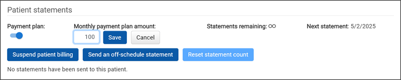 Payment plan: Use this section to turn a payment plan on or off for a patient account. Use the "Monthly payment plan amount" to set the dollar amount to be paid on a monthly bases. View how many statements remain and when the next statement will go out. To learn more, go to Patient Payment Plan.