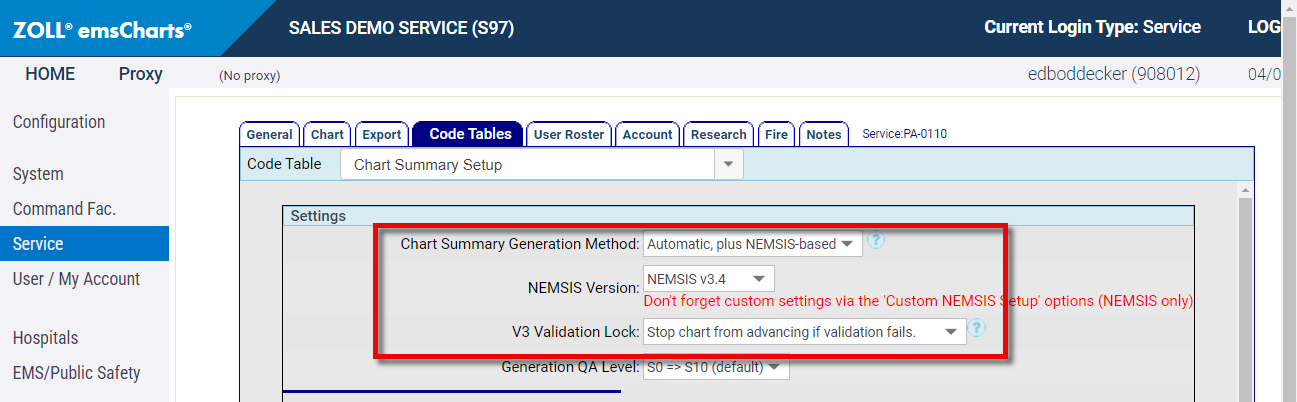- Code tables: Includes the Chart Summary Setup, Transport Disposition Options, and the Custom NEMSIS Setup. Look below for information on how to configure these tables.