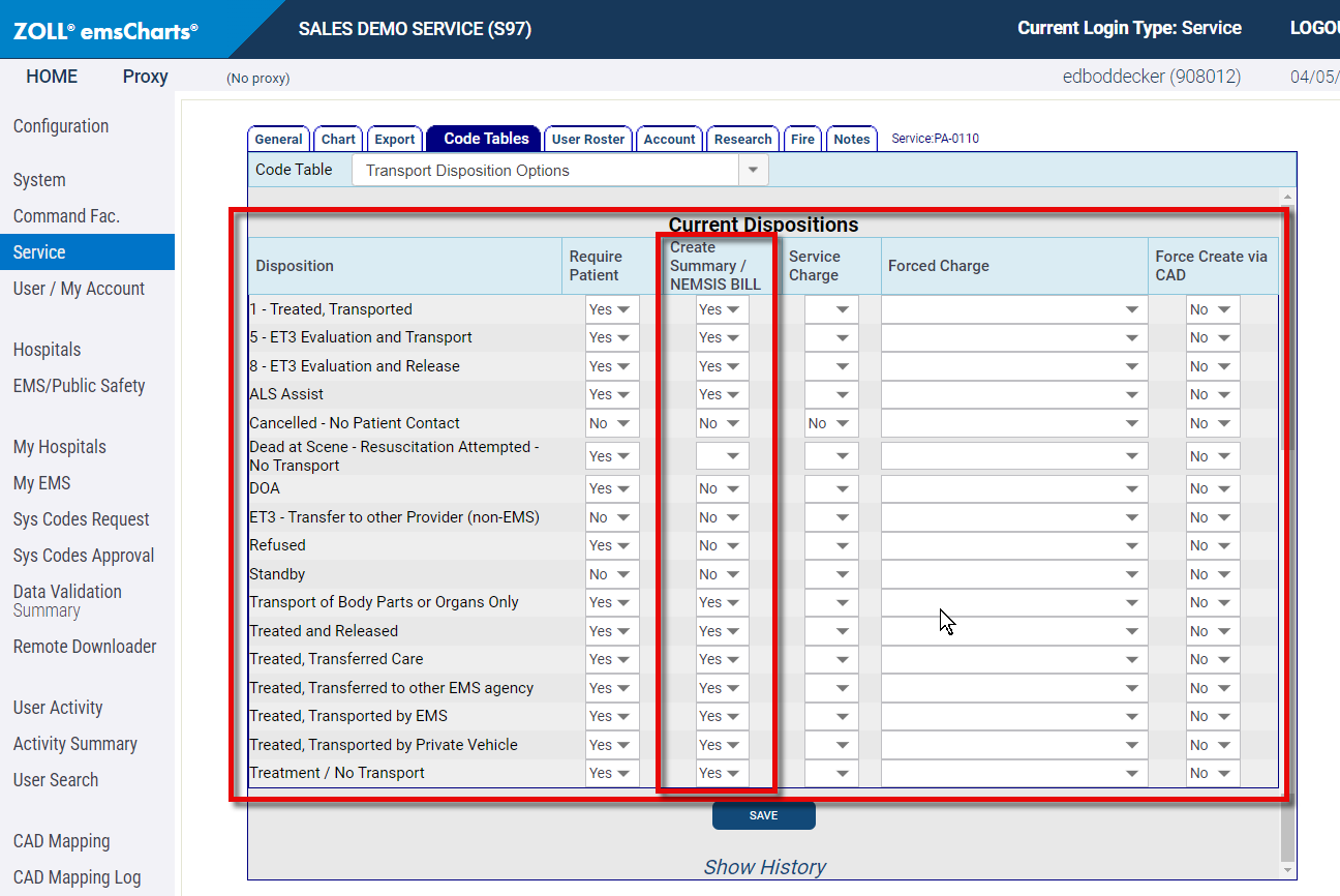 In the Current Dispositions section, Create Summary column, ensure that every disposition you want to send to ZOLL Billing has a Yes entry. If not, change it to Yes and then click Save.
