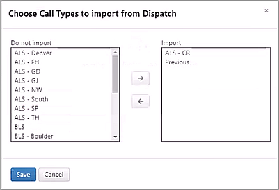 Check the "Filter by Call Type" box. A list of call types configured in Dispatch will display in a pop-up window. Select the call type from the "Do not import" box, and then click the right arrow to move it to the "Import" box. When you are done creating the list of call types click Save.