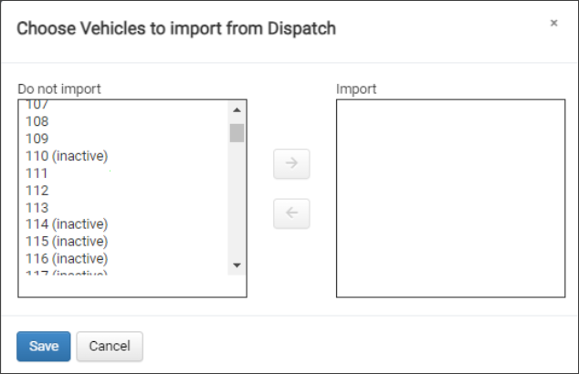 Check the "Filter by Vehicle" box. A list of the vehicles configured in Dispatch will display in a pop-up window. Select the vehicle from the "Do not import" box and then click the right arrow to move it to the "Import" box. When you are done creating the list of vehicles, click Save.