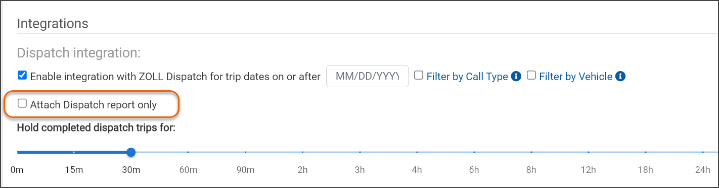 ZOLL will work with you to enable the integration with Dispatch. As part of the implementation of this integration, ZOLL will check the 'Enable integration with ZOLL Dispatch' box and set a date for the imports to start.
