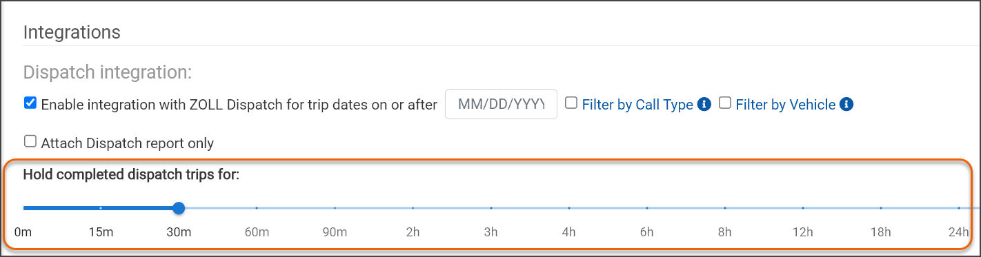Use the "Hold completed dispatch trips for" slider to hold a Dispatch record for a number of minutes or hours while waiting for its associated NEMSIS file to import and create the claim.
