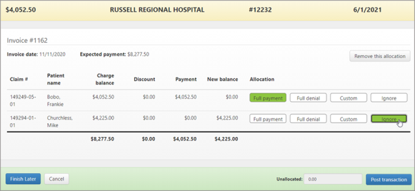 Full payment: Allocate the transaction amount to the claim's balance. If the transaction amount is greater than the claim's balance, additional claims can be selected.