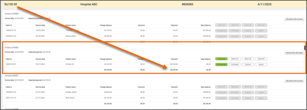 If the transaction amount exactly matches the charge amount for an invoice, the system will automatically allocate the amount to that invoice and enable the invoice's action buttons.
