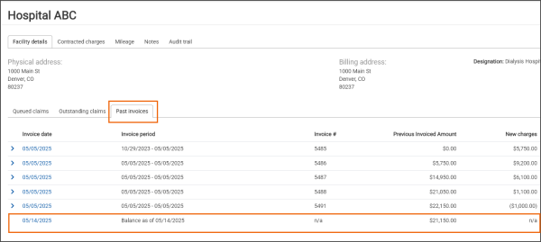 Use the "Past Invoices" tab to view all invoices made in the past for this facility. Information in this tab includes the invoice date, the invoice period and number, previous invoiced amount, new charges, posted contractuals, and invoiced amount.