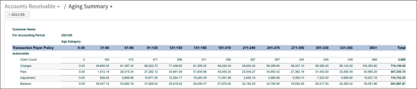 The Aging Summary Dashboard show a summary by payer policy for the transaction, and aged by days from the service date to the selected ending period.
