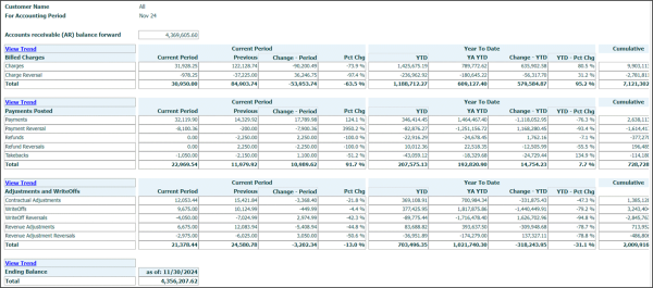 View Trend Adjustments and Writeoffs: View adjustments and writeoffs for a 13-month trailing including changes verses previous periods.