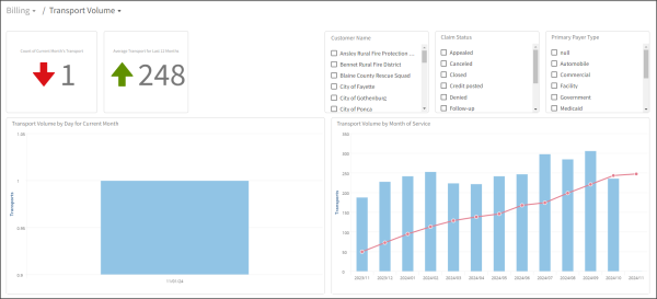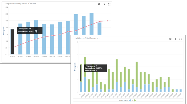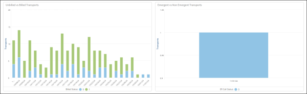 The bottom half of the dashboard displays the unbilled verses billing transports and the emergent verses non emergent transports.