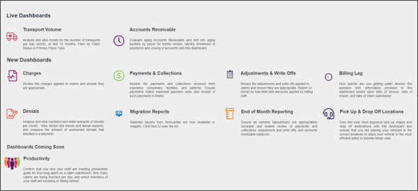 Migration reports: Agencies migrating from RescueNet to ZOLL Billing have expressed the need to have reports, similar to RescueNet, for ZOLL Billing. There is a list of migration reports available in Insights.