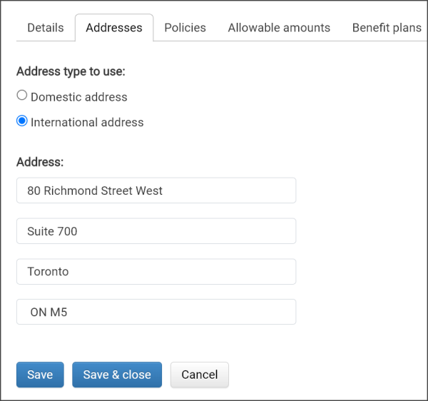 Because payers with international addresses are not supported by a clearinghouse submission, when you create the benefit plan for a payer with an international address, the primary and secondary submission fields display "Manual submission" and will be disabled (grayed out).