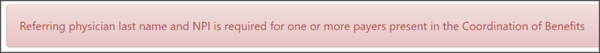 Note: The "Require referring physician" insurance requirement will only apply to the current payer that has this requirement activated. For example, if Aetna is the primary payer and this requirement is set, then the referring MD first and last name, as well as the referring MD NPI, must be filled out before the claim can be submitted. If the claim progresses to a secondary insurance that does not have the "Require referring physician" requirement set, then this restriction no longer applies. Again, it is only for the current payer that has this requirement set.