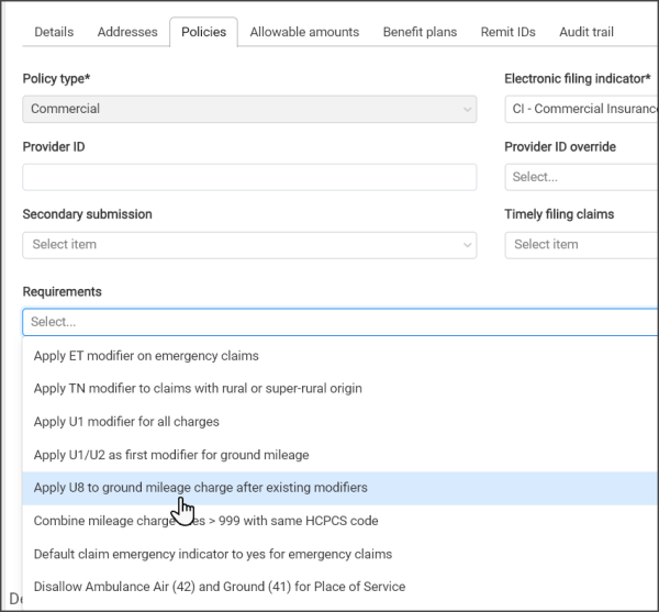When "Apply U1 modifier for all charges" is selected, a U1 modifier will automatically populate on charges for specific payers. This requirement can be applied to both policy and benefit plans and will display the U1 modifier after an existing modifier code.