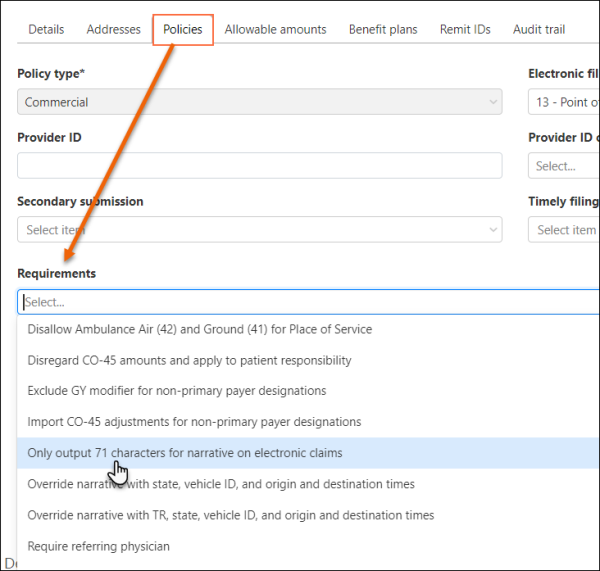 On the policy or benefit plan, click the Requirements field and select Override narrative with TR, state, vehicle ID, and origin and destination times.