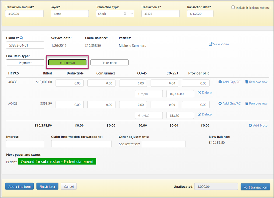 6. Scroll down to the bottom of the page and verify that the unallocated amount is zero.  You can't post the denial until the unallocated amount is zero.