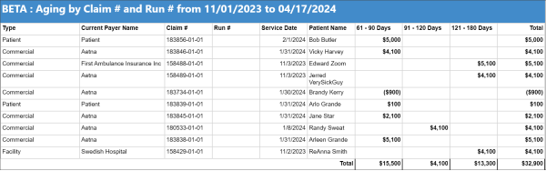 This report shows the payer type and name, the claim and/or run number, the service date, patient name, and total. The aging is calculated by the service date and displays in three columns, 61 - 90, 91 - 120, and 121 - 180 days. Run the Aging by Claim Number and Run Number weekly by service or deposit date to track claims with balances over 61 days.