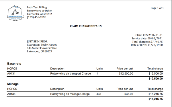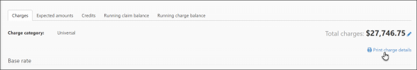 The Claim Charge Details report shows the base rates and mileage charges by HCPCS for a specific claim. The report can be found on the Claim page under the Charges tab.