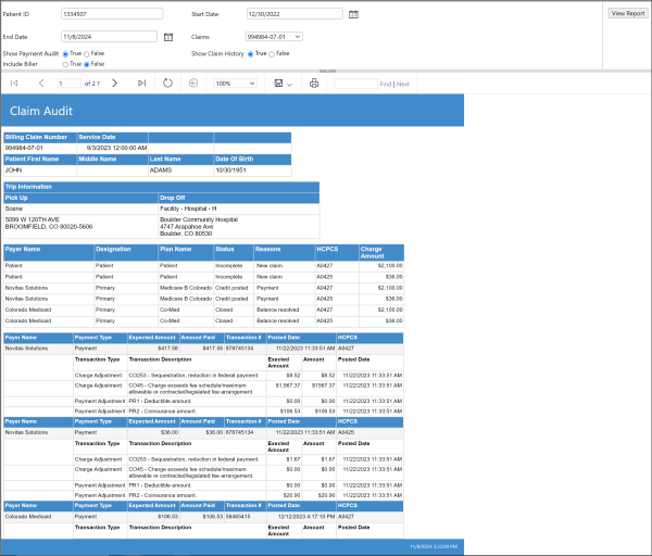 The Claim Audit report shows claim details for a specific patient account within a specified time period.