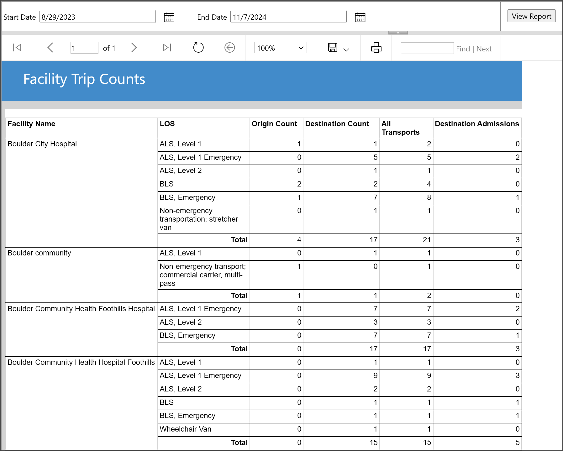 The Facility Trip Counts report shows the level of service (LOS), origin and destination count, and total number of all the transports and destination admissions by facility name within a specified time period.