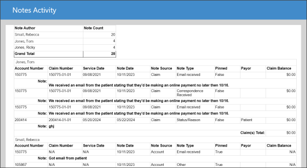 Per biller, the Note Activity report shows notes entered for a claim, the claim number, service date, note date, note type, payer, and claim balance.
