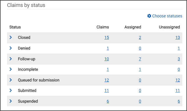 The "Claims by status" section lists the status, the number of claims in each status, and how many are assigned/unassigned. Use the open/closed arrow to see claims broken into status reasons.