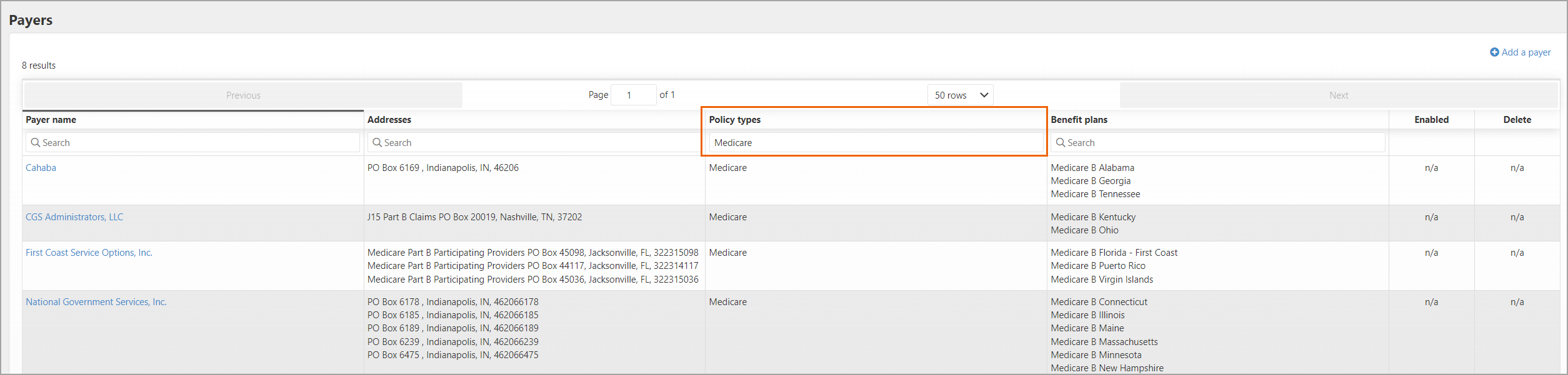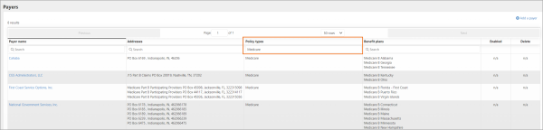 To view a list of Medicare payers, click Payers on the navigation bar. On the Payers page, enter "Medicare" in the filter box under "Policy types." To print a page, right-click on the table and click print.