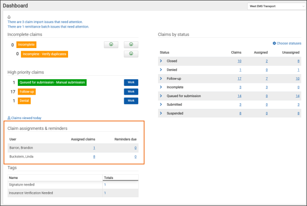 To find claims assigned to users, look under the "Claim assignments & reminders" header.