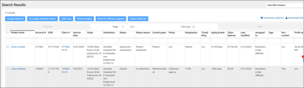 A page opens that lists the individual claim numbers and claim information such as the patient name, claim status, current payer, and timely filing countdown.