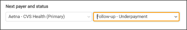 • The first field will allow you to select the payer. When clicked, a list will display the payers from the COB, including the patient and the facility (if one exists on the COB). The payers will display in the order they exist on the COB (i.e. primary payer will display first, secondary payer second, etc.). If you move to a previous payer, the claim status field will default to the status associated with that payer unless the payer has not yet been billed. In that case the status will default to "Queued for submission" with the same override options as on the claim.