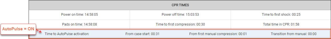 When the AutoPulse setting is ON, the CPR Times table at the bottom of the Performance Summary page will include an additional summary row of times.