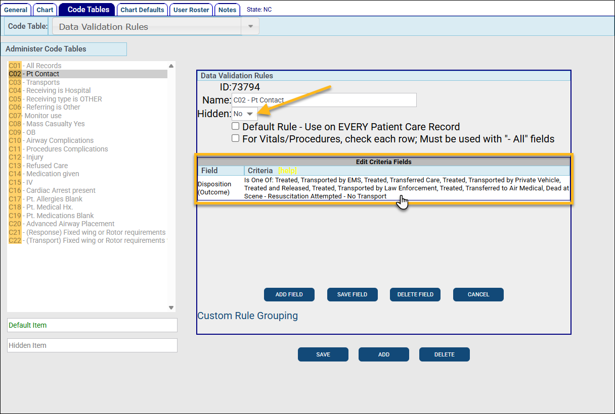 Since the standard ruleset is hidden by default, an administrator must enable the rules before they will trigger when charting. You can customize the standard validations to your agency's workflow. For example: