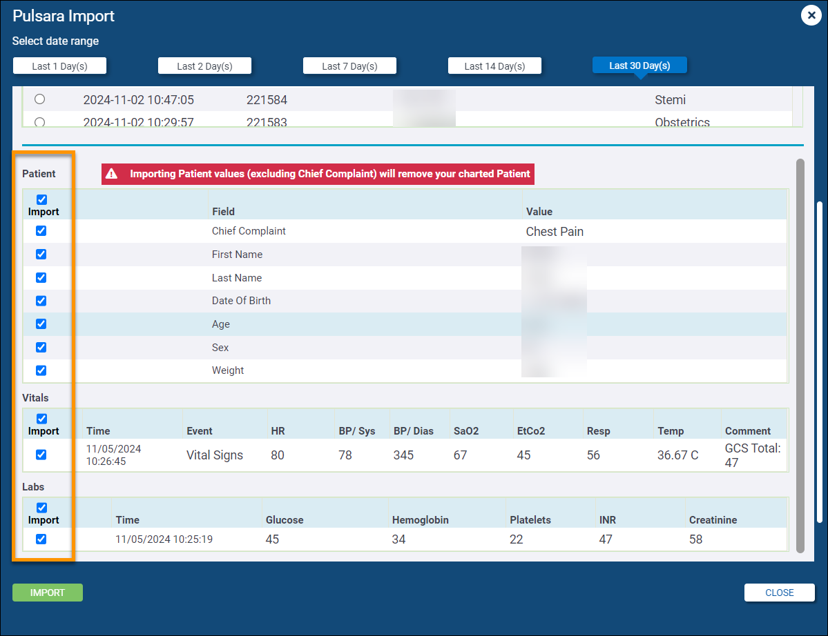 4. You will be presented with all the data captured by Pulsara that can be imported for the selected item. Choose which datapoints you wish to import, or use the checkbox at the top of each section (Patient, Vitals, Labs) to select all the datapoints for that section. You can un-check specific line items if needed. Click IMPORT when you have made all your selections.