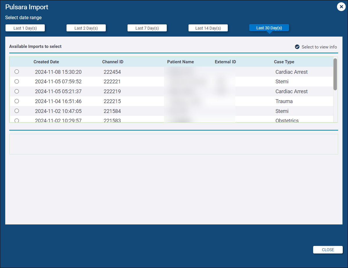 3. You will be presented with a list of available Pulsara Imports. The default date range is the last day, but you can choose from the other available date ranges, up to the last 30 days. Select the Pulsara case to view the data available for import.