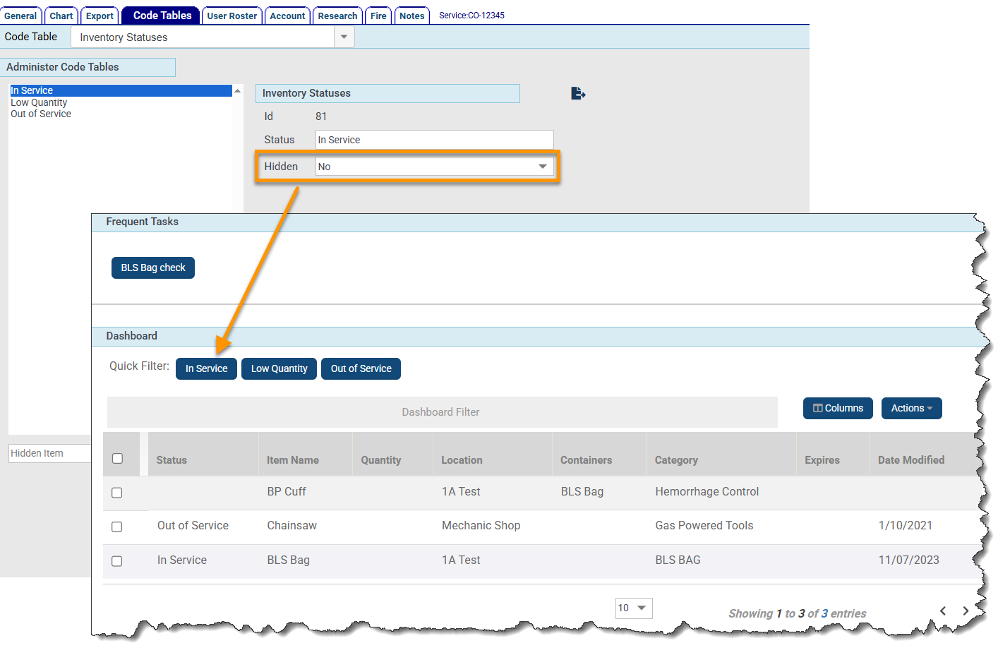 In the Inventory Statuses code table, you establish the name for the status. A status could be ‘par – in service’, ‘broken’, ‘expired’, ‘out for repair’, ‘reorder’, etc. Choose words that are common in your agency to describe the state of items.