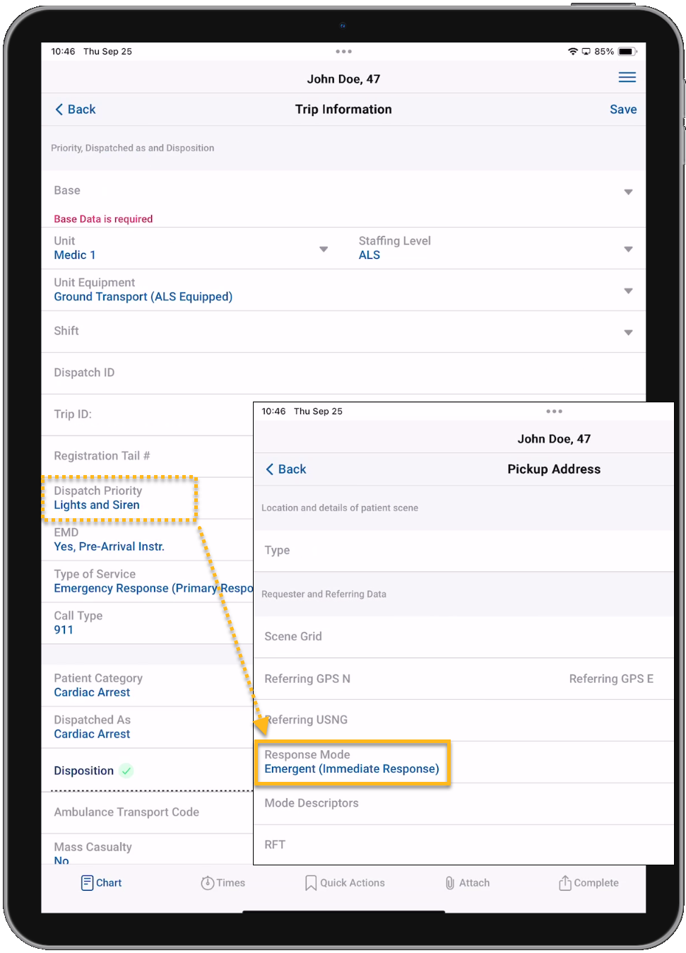 • The NEMSIS 3 Dispatch Priority configuration is now respected in emsCharts NOW which will auto-populate the Response Mode on the Pickup Address page based on the selected Dispatch Priority on the Trip Information page.