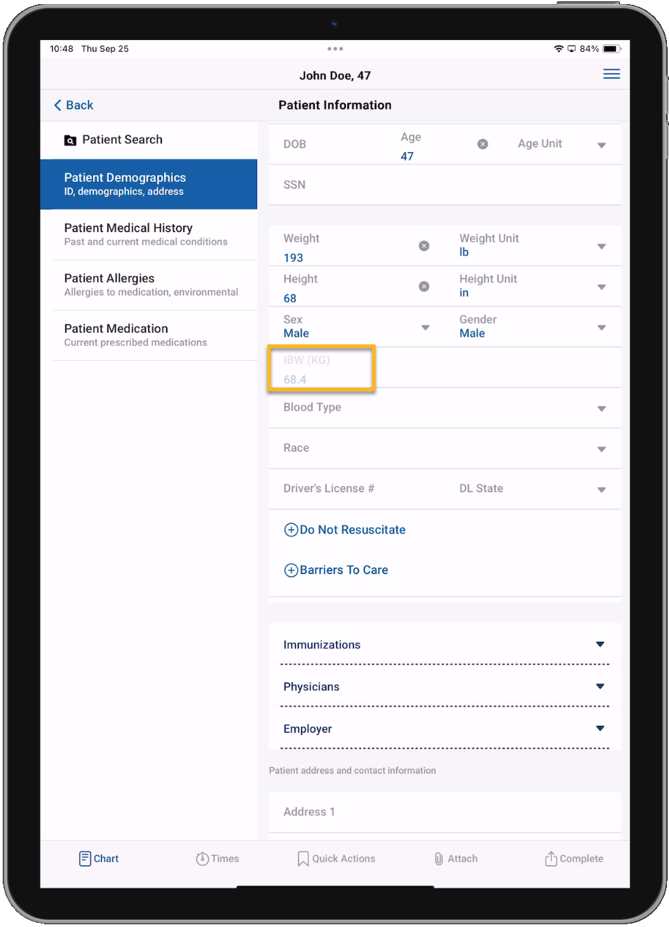 • A new Ideal Body Weight field will automatically calculate and display the ideal weight of a patient when the patient's sex and height are entered.