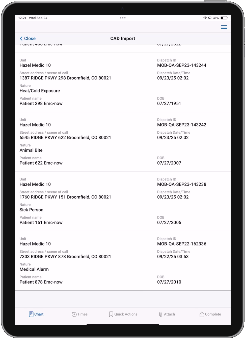 Once you have found the CAD record you wish to import, select it and tap Import. You can then disable any data you do not wish to import. Once you are done reviewing the data for import, tap Save. The CAD data will be imported and you will be brought to the Patient Care Report landing page.