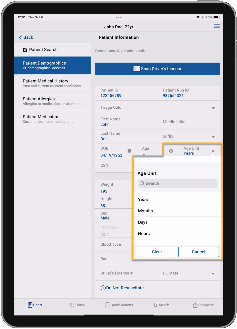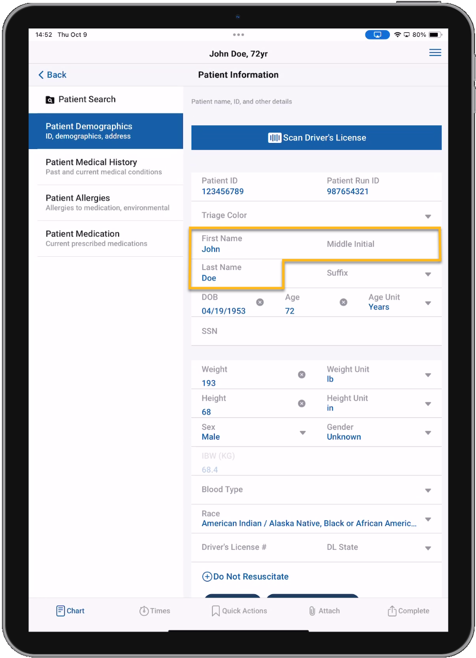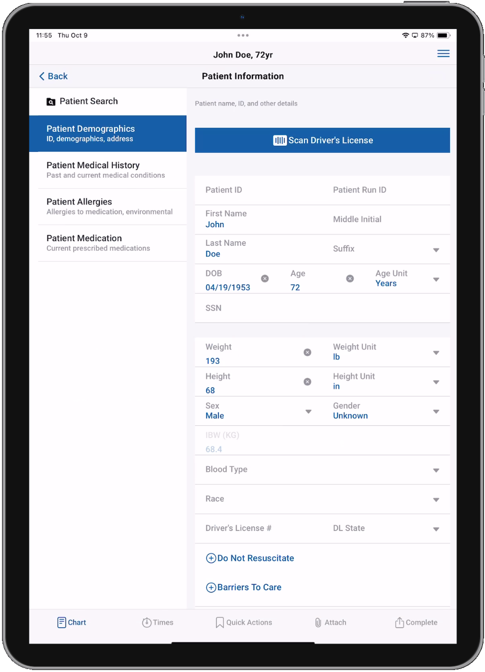 Here you will document the patient's name, date of birth, height, weight, gender, and address along with other demographic information. You can tap the Scan Driver's License button to scan the patient's driver's license and automatically import their demographics information. Learn more about the driver's license scanner feature.