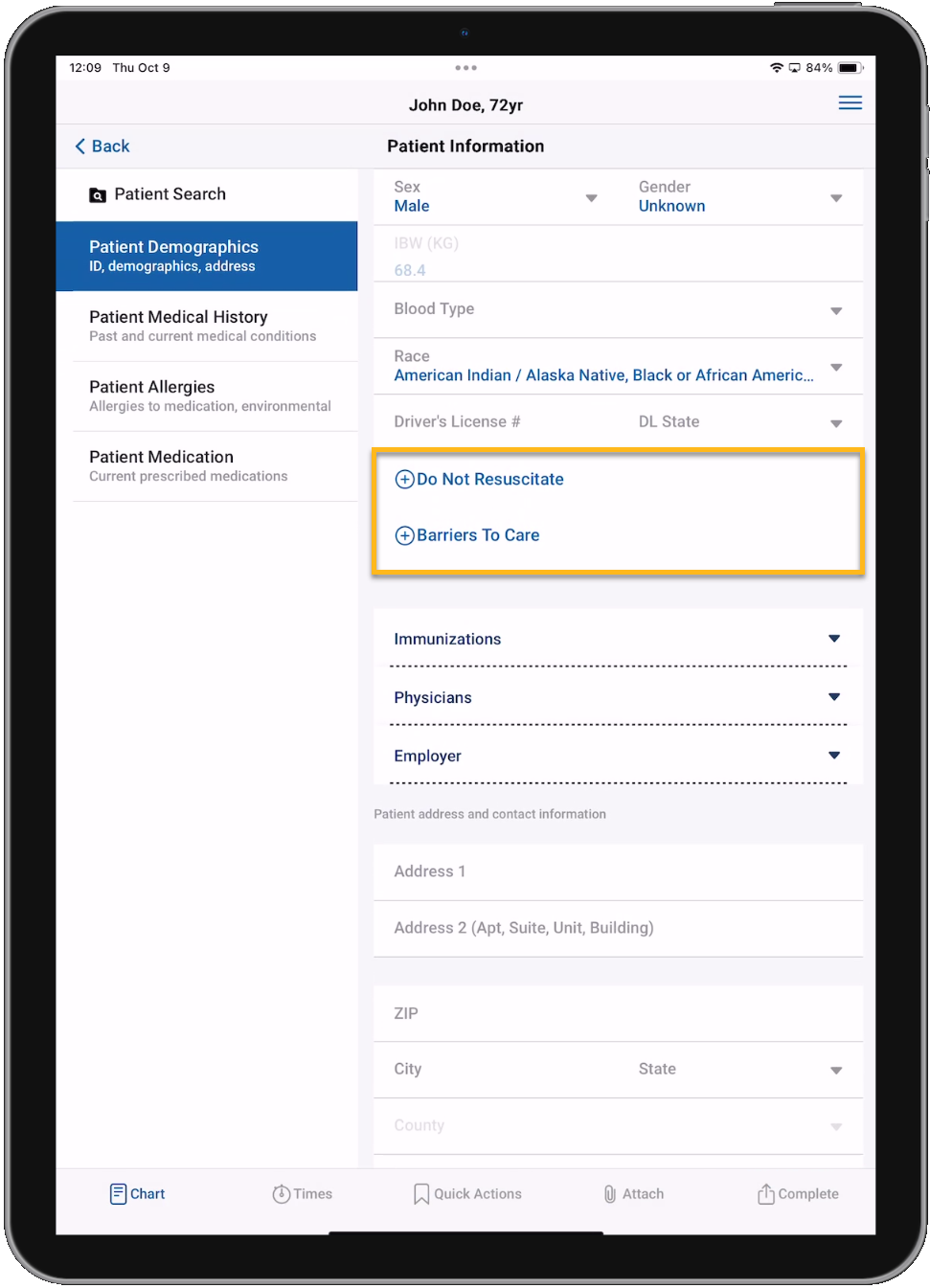 The 'Do Not Resuscitate' and 'Barriers To Care' fields look a little different, but function similar to other multi-select fields. When you tap them, a multi-select picklist displays and you can select as many options as you need. Once you select and save values to those fields, they will display a chip for each selection. If the selections won't fit in the field, they will display a green check mark indicating values have been selected, and you can tap the field to view and edit the values.