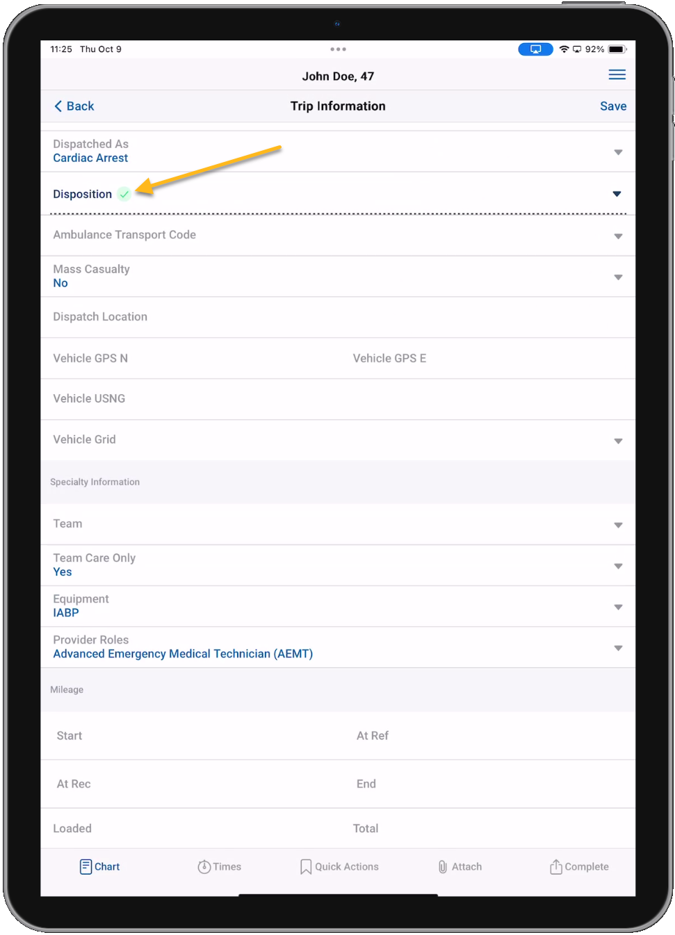 Expandable sections like 'Disposition' will expand when you tap them and display multiple fields. The Disposition expandable section contains both single-select and multi-select fields. The NEMSIS 3.5 Disposition fields can be configured with default values based on the value entered into the Disposition field.