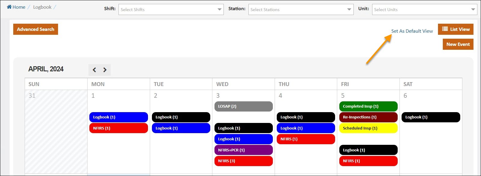 When you are on a view that is not currently your default, you will have an option to 'Set As Default View'. In this example, if we click Set As Default View, the Calendar View will be our new default and each time we access the Logbook, it will display the Calendar View. Switching back to the List View will give us the option to 'Set As Default View' if we want to change it back.
