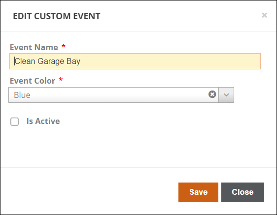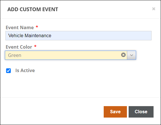 Click Add Custom Event to add a new custom event. Enter the Event Name and select the Event Color for the event grouping on the Calendar View. Unchecking 'Is Active' will hide the custom event category so it will not be available to use when adding events in the Logbook. Click Save when finished, or Close to cancel.