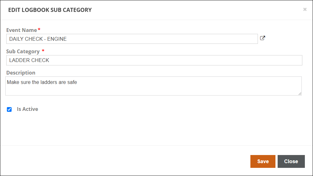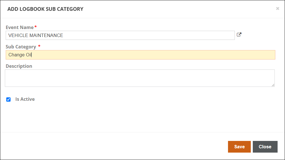 You can edit an existing custom event sub-category by clicking on it. You will have the option to switch the Custom Event it is tied to, rename the Sub Category, and change the Description. Unchecking 'Is Active' will hide the custom event sub-category so it will not be available to use when adding events in the Logbook. Click Save when finished, or Close to cancel and lose your changes.